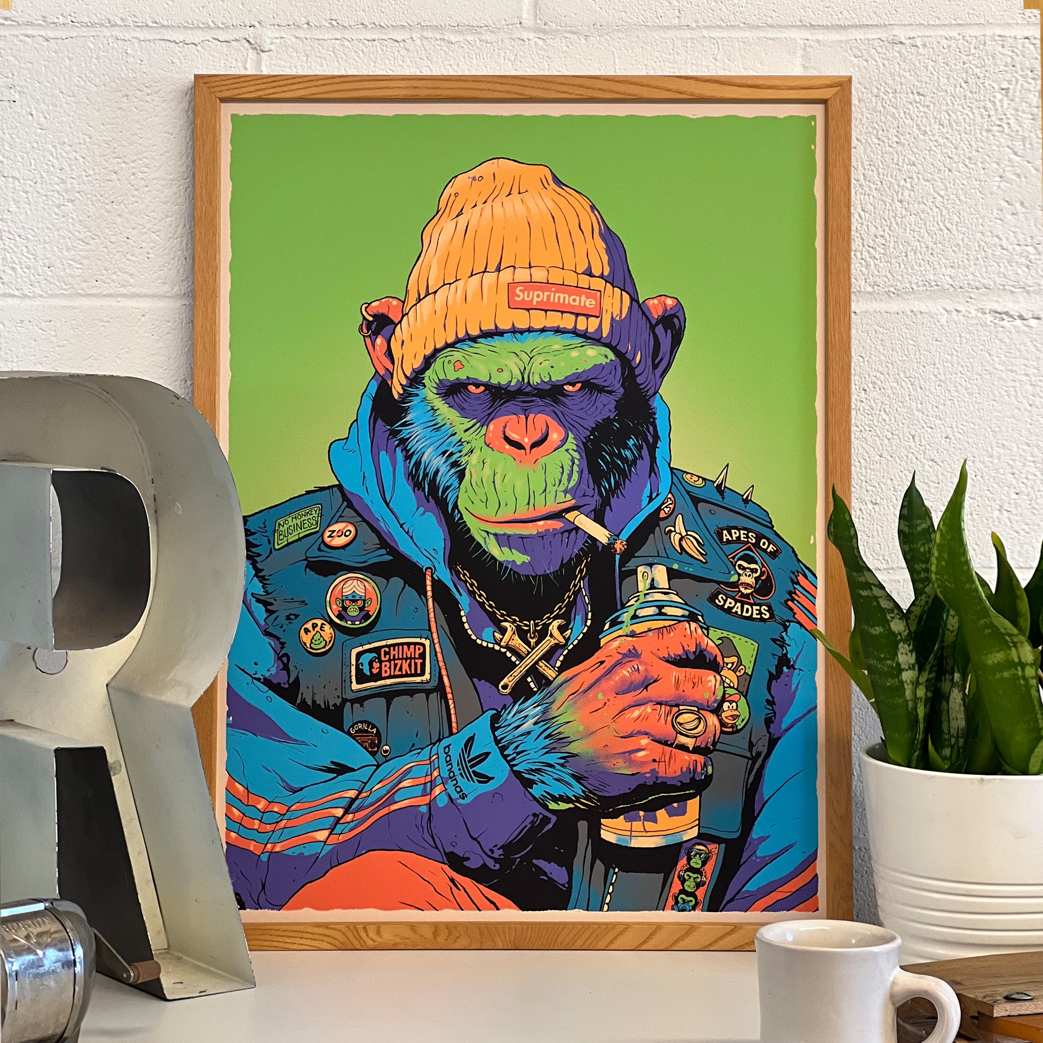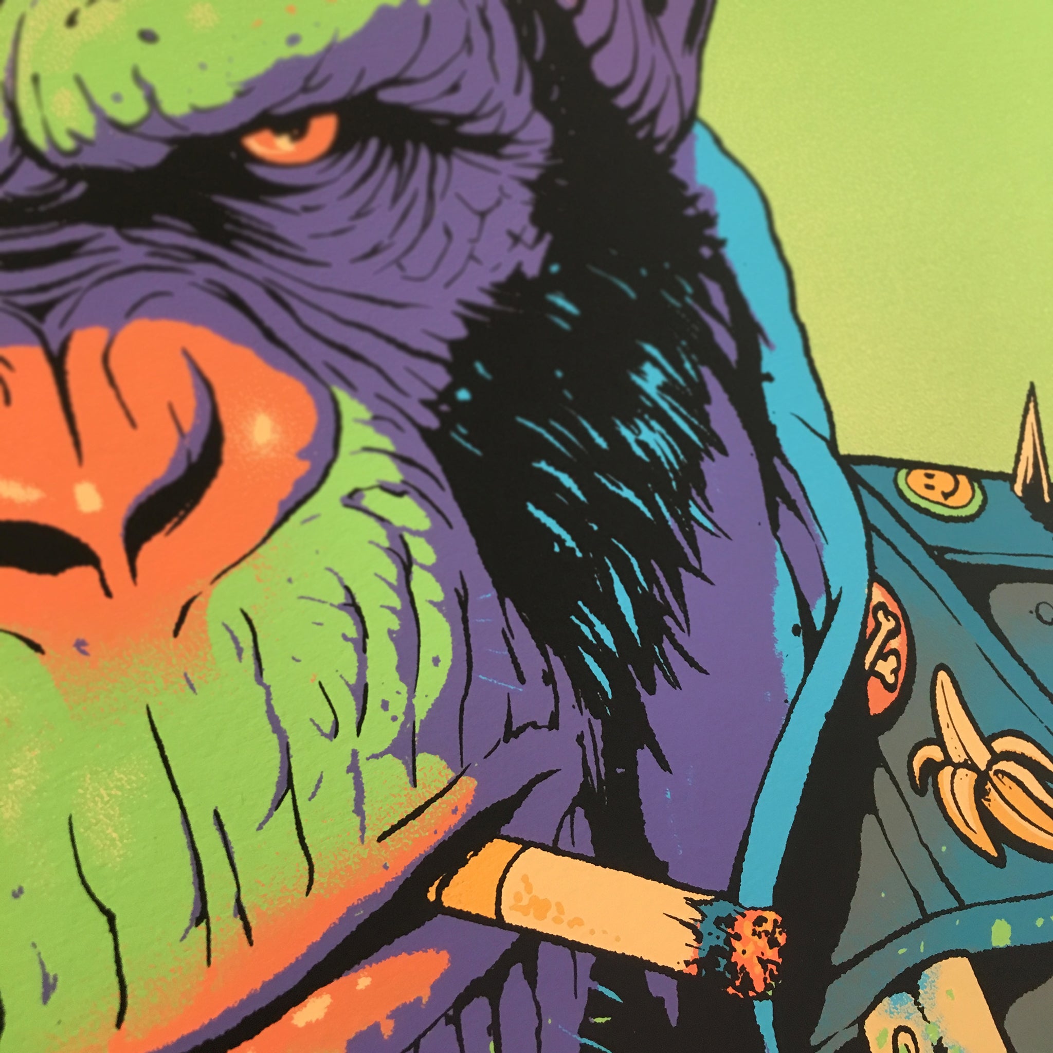 Niclas Mortensen's iconic "Monkey" design produced as an 18 x 24", 9 color screen print with neon colors on 111# Keakolour cover stock. This punk monkey will brighten up any wall and spike conversation with all the easter eggs in the details, enjoy!