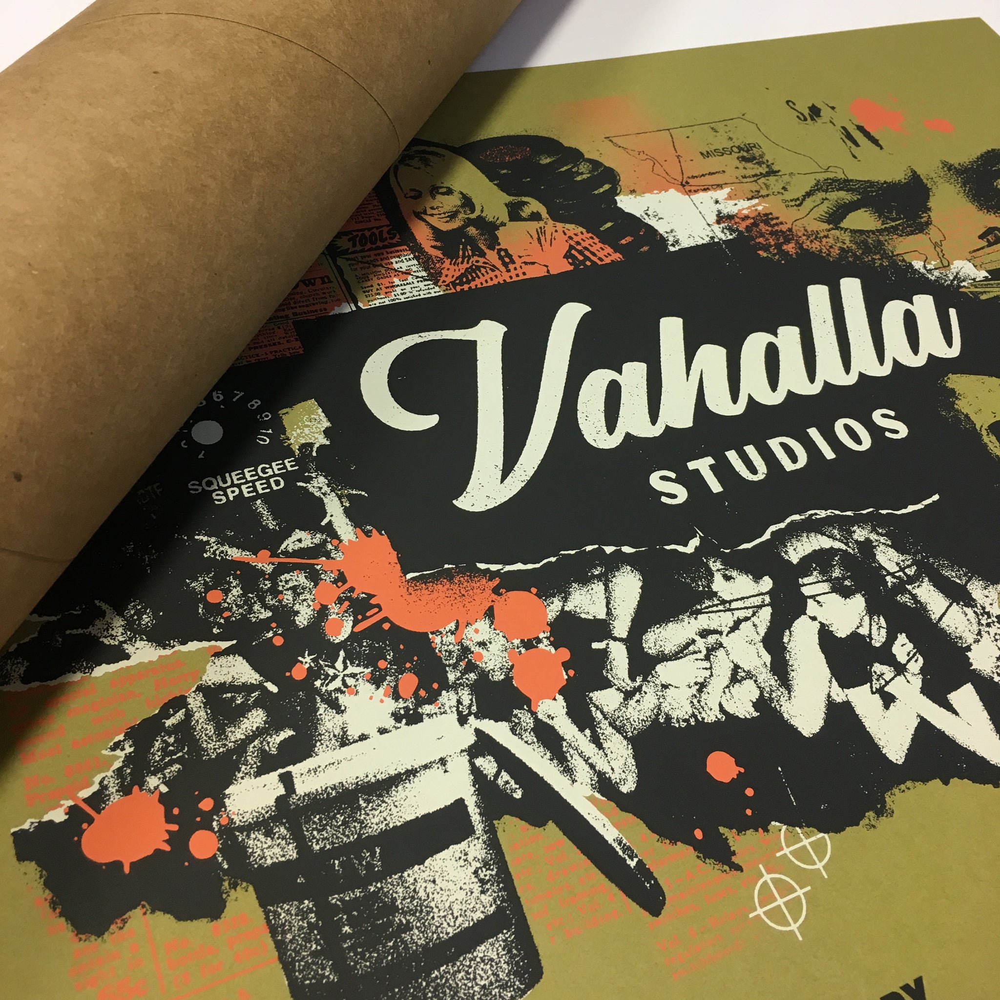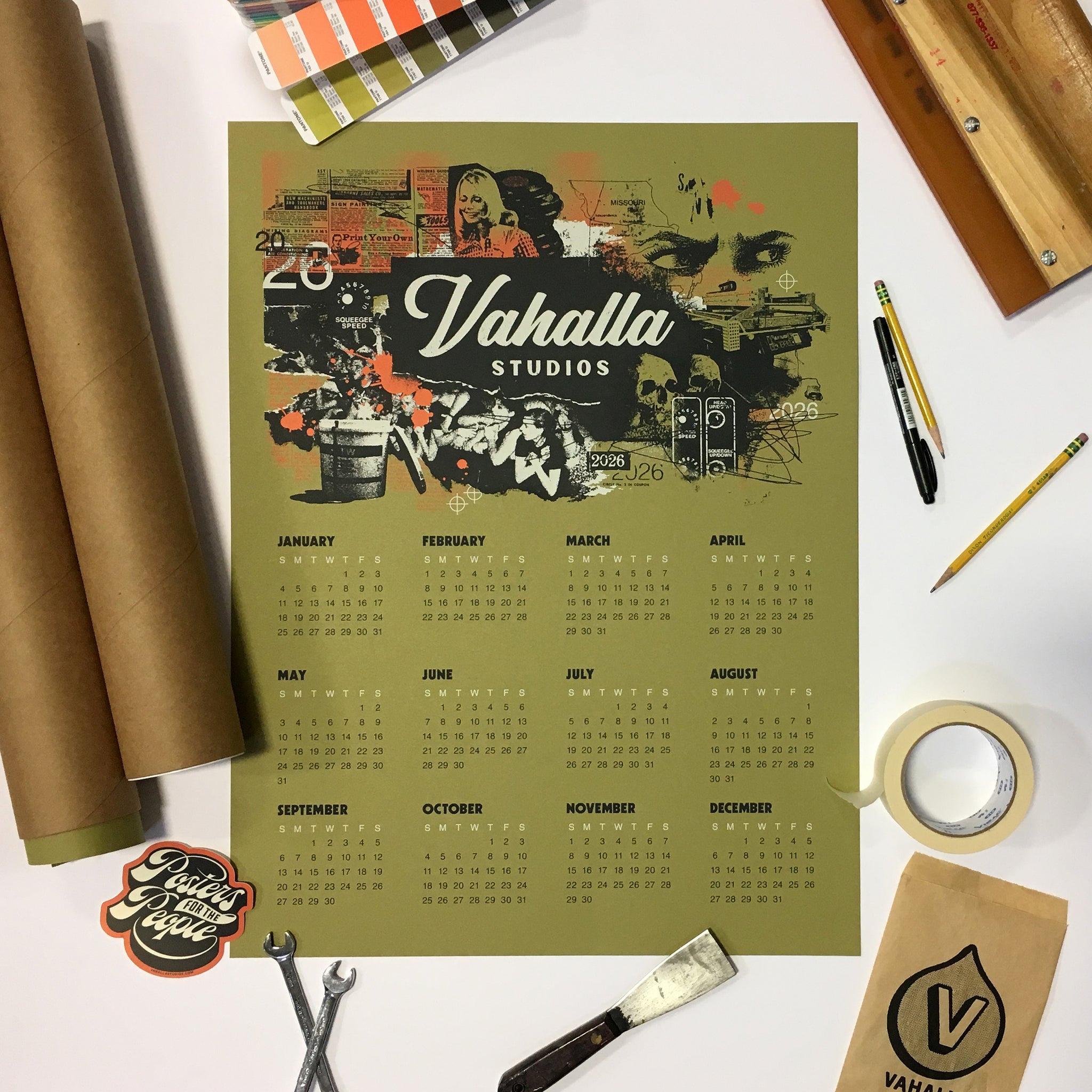 Thanks to all our fans & clients for another great year at the shop! This screen printed calendar was designed in-house and features found imagery inspired by the past, present and future identity of Vahalla as a silkscreen print shop.